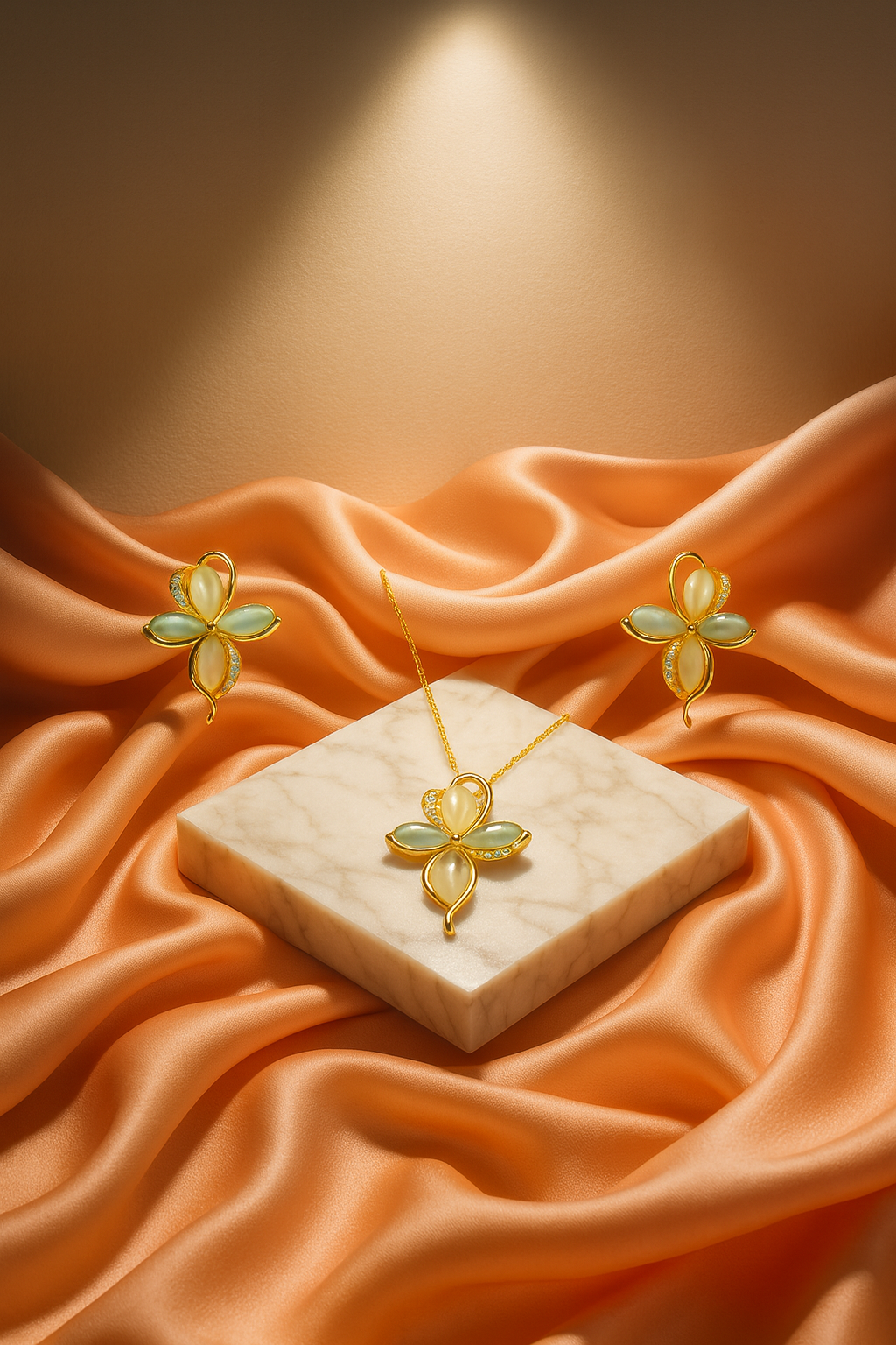 The Aurelia BloomDance Set is inspired by the gentle movement of blossoming petals caught in a soft spring breeze. Each piece features a flowing floral motif made of smooth pastel-yellow and sage-green petals, shaped to create a delicate, dance-like silhouette. Sparkling crystals accent the golden curves, adding brilliance without overpowering the natural softness of the design.